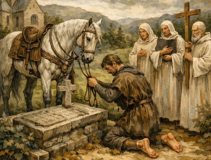 Als Heinrich das hörte, wurde er von großer Furcht ergriffen. Denn jener Freitag, an dem Kuno starb, war der Gerichtstag, den ihm der Verstorbene bestimmt hatte. Er machte sich eiligst mit dem Pferde nach Himmerod auf und brachte es barfuß an das Grab Kunos. Dann übergab er es dem Kloster. Er trat dann selbst in dieses ein, um sich auf einen guten Tod vorzubereiten.